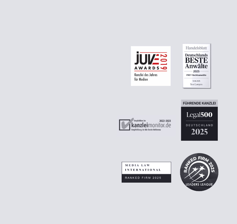 The Legal 500 Deutschland zeichnet FREY Rechtsanwälte in ihrem aktuellen Ranking 2025 erneut als führende Kanzlei im Praxisbereich Medien – Entertainment aus. Eine besondere Empfehlung als Spitzenkanzlei erhielten wir auch dieses Jahr wieder im Bereich Urheberrechtliche Streitigkeiten. The Legal 500 Deutschland ist eine renommierte internationale Plattform, die Inhouse-Abteilungen bei der Auswahl einer passenden Kanzlei unterstützen soll. Für die jetzige Ausgabe wurden bis zum Sommer letzten Jahres hunderte von Interviews und Befragungen mit Anwälten und mehr als 23.000 Mandanten durchgeführt. Diese Recherche ist in eine detaillierte Analyse eingeflossen, die eine umfassende Bewertung der Stärken und Fähigkeiten von Kanzleien in 23 Praxisbereichen mit 90 Rankings erlaubt.